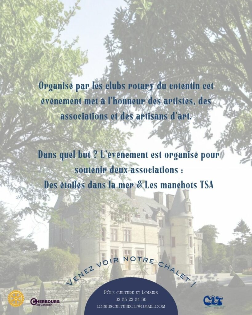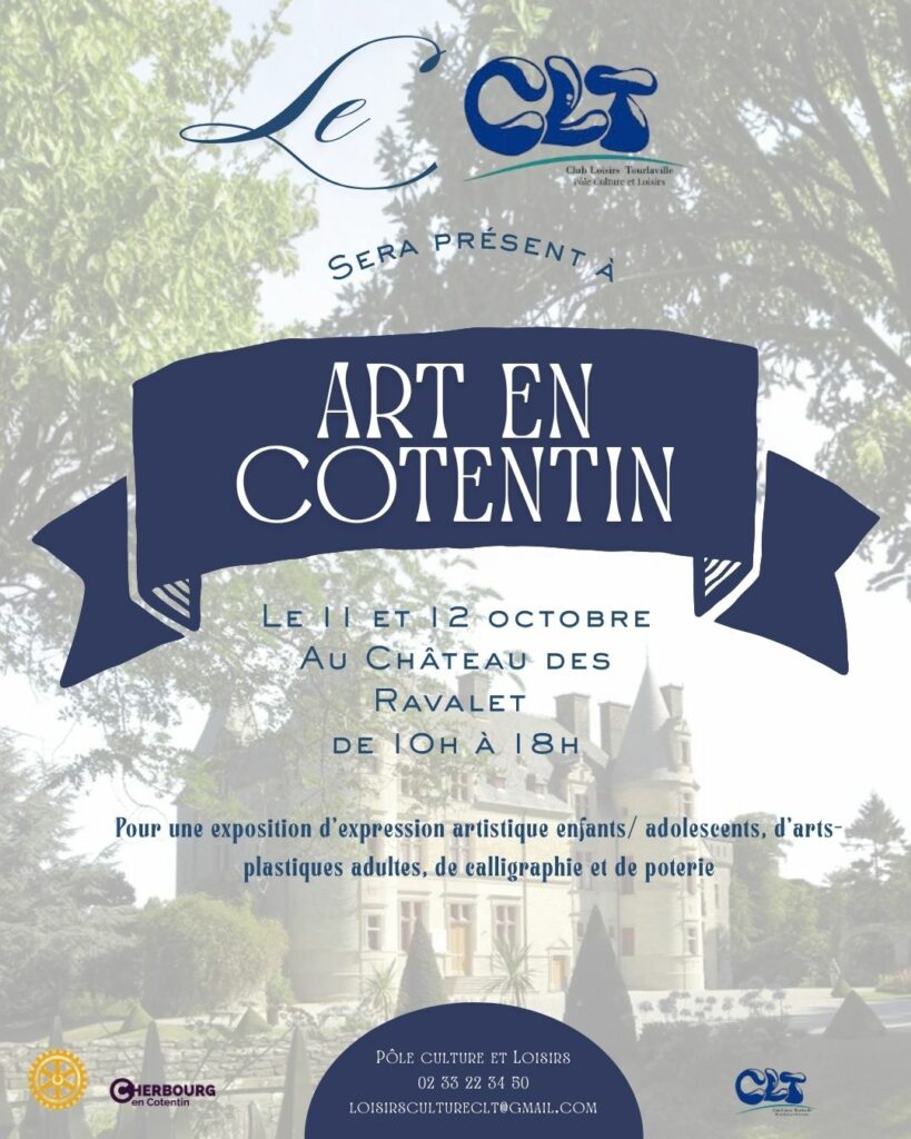Art en Cotentin au Château des Ravalet les 11 et 12 octobre (de 10h à 18h), événement organisé par le Rotary pour soutenir deux associations Des étoiles dans la Mer et Les Manchots TSA. Vous y retrouverez plusieurs actions artistiques et culturelles, aussi bien pour les enfants que les adultes et une exposition des  oeuvres de certain-es d’entre vous dans  notre chalet CLT  > Lien: https://www.artencotentin.fr/